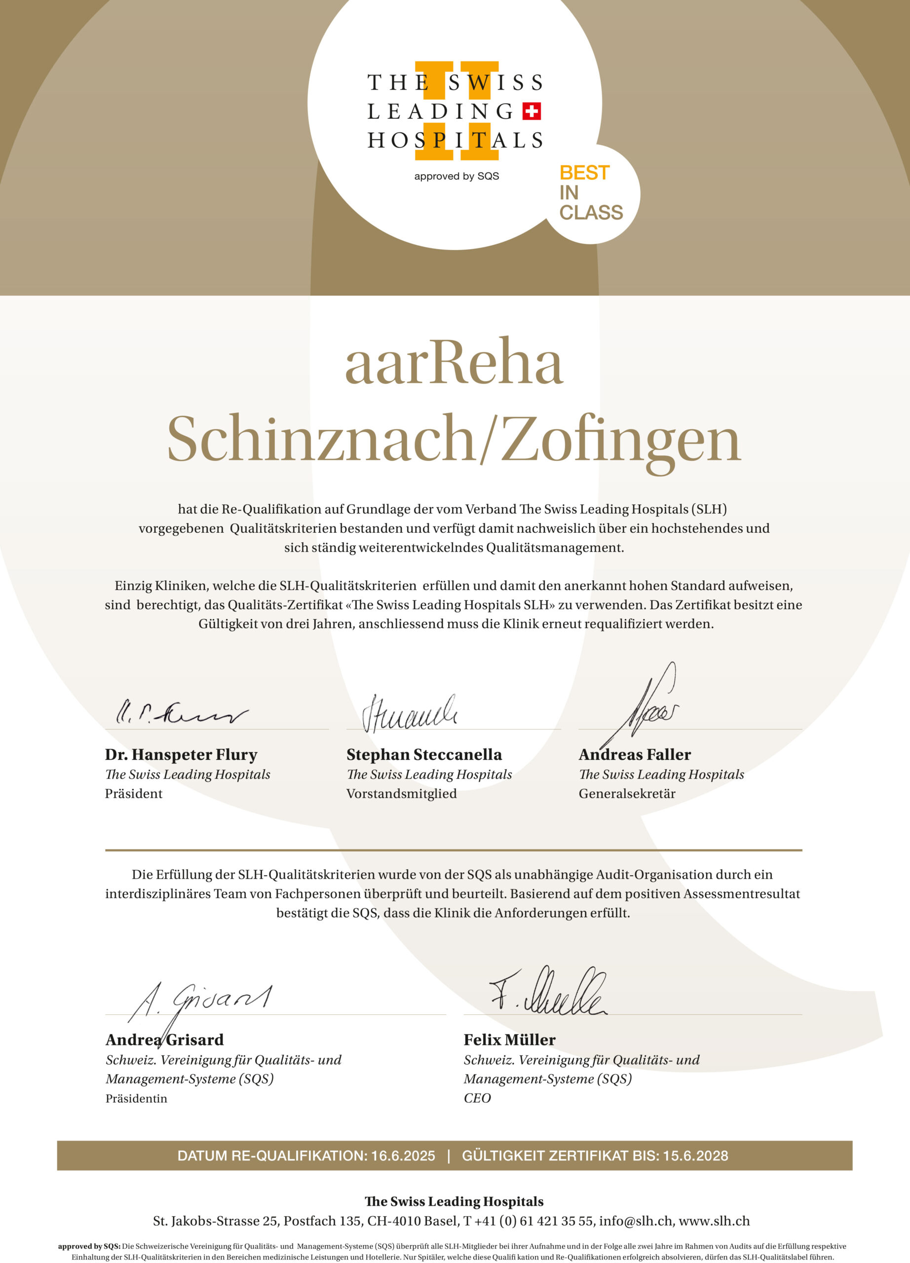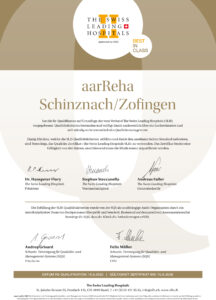 Die aarReha Schinznach besteht die Re-Zertifizierung der The Swiss Leading Hospitals ohne Hauptabweichung und erhält das Zertifikat für weitere drei Jahre. Mit dem renommierten SLH-Zertifikat bekennt sich unsere Klinik zur Patienten-Betreuung und Behandlung auf höchstem Niveau.