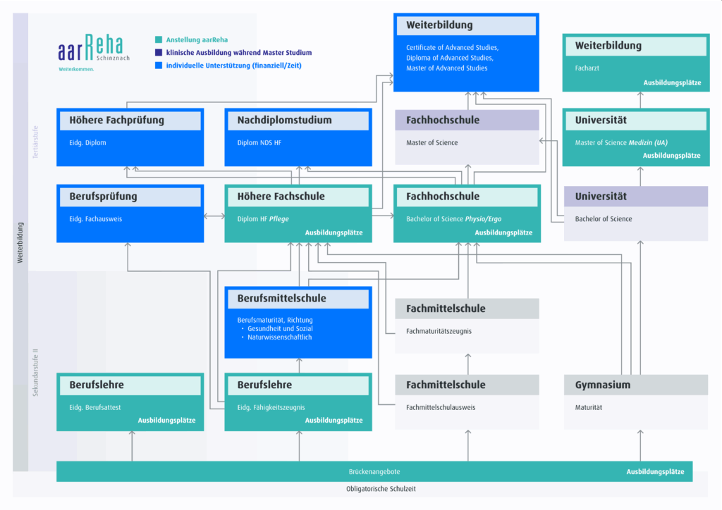 Bei den Ausbildungen im Therapie-Bereich arbeitet aarReha mit renommierten Fachhochschulen zusammen. Im Bereich Pflege mit verschiedenen höheren Fachschulen. Auch ist Nachholbildung und bei Bedarf eine begleitete Ausbildung möglich.